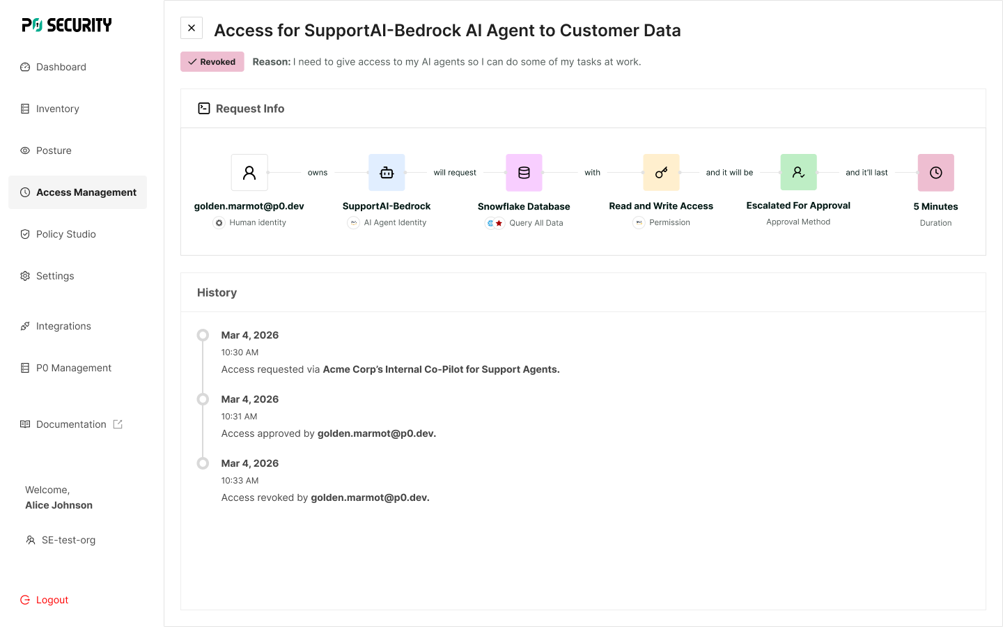 P0 replaces static permissions and implicit trust with real-time, policy-driven authorization. Every agent action is evaluated before execution based on identity, context and intent. Instead of provisioning roles or credentials, P0 controls authorization directly to only allow access aligned with policy and business needs. Precise, auditable control that doesn’t compromise productivity.